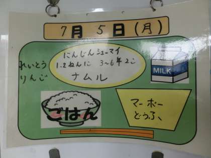 今日の献立は、ごはん、にんじんシューマイ、ナムル、マーボー豆腐、冷凍リンゴでした。