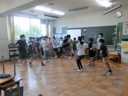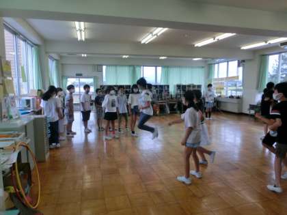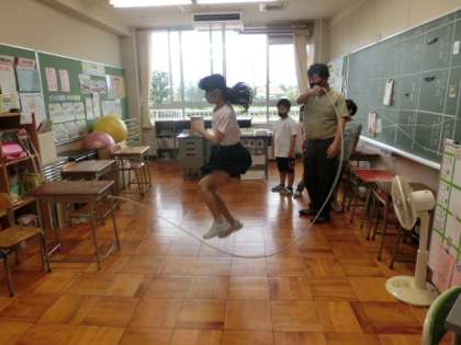 各教室では、机を下げて大なわとびをしました。8の字跳びをしている学級では、1分間で何回跳べるかとか、100回を何分で跳べるか等の記録にチャレンジしていました。また、大なわの片方を机に結んで跳んでいる学級もありました。