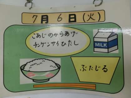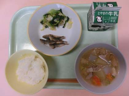 今日の献立は、ごはん、牛乳、こあじの唐揚げ、チンゲンサイひたし、豚汁でした。
