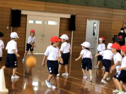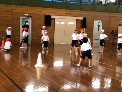 1年生の体育で取り組んでいるのは。前半後半で攻防が入れ替わるドッジボールです。上手に敵に当てるコツや逃げるコツについて話し合ってから試合をしました。体育の後はどの子供も汗びっしょりでした。