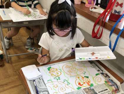 初めて学校で水彩を使いました。用具の使い方を覚えると、どの子供も真剣な表情です。「こんな花が咲いたらいいな」と思いを膨らませながら塗っていました。最後の仕上げは、自分の姿を描くことです。遊んでいる自分、花のつるにぶら下がる自分等、思い思いに描きました。