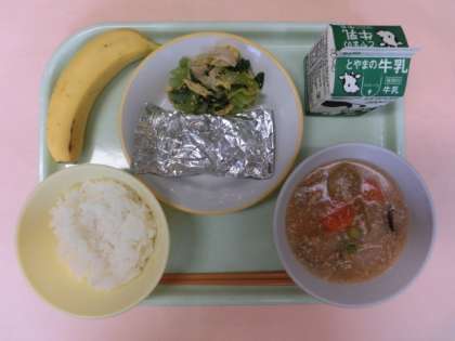 今日の献立は、ごはん、牛乳、サバの銀紙焼き、ごま和え、冬瓜のそぼろあんかけでhした。