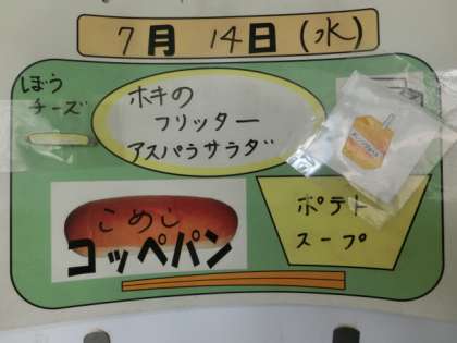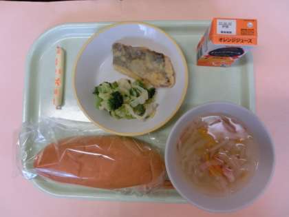 今日の献立は、米粉コッペパン、オレンジジュース、ホキのフリッター、アスパラサラダ、ポテトスープ、棒チーズでした。
