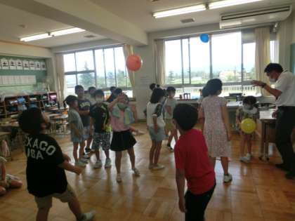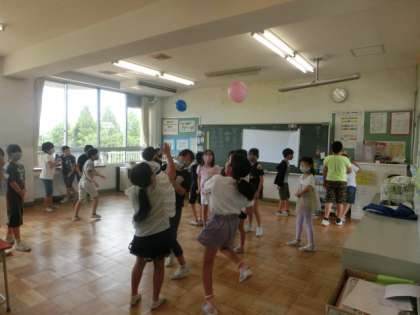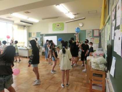 各教室では、保健室から借りてきた風船を班に配り、言葉をかけ合いながら風船ゲームをしました。