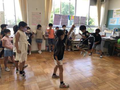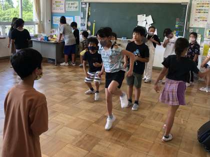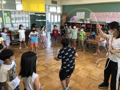 今日の「すこやか運動」は、エアコンの効いた屋内での大なわとびでした。各学級では子供たちが記録を伸ばそうと、楽しみながらカウントしていました。