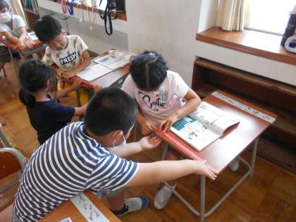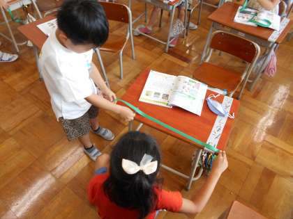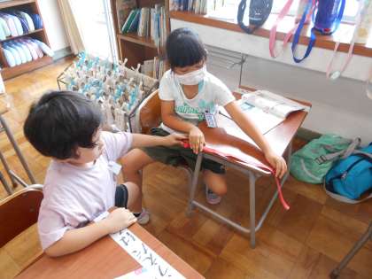 1年生:「算数 ながさくらべ」:7月20日(火) 公開日 2021/07/20 更新日 2021/07/20 1年生の部屋 算数では、机の縦、横を紙テープを使って、長さを比べる活動をしました。ペアで協力している姿が印象的でした。 その後、手を使って長さを比べる活動も行い、様々な物の長さを手で測っていました。