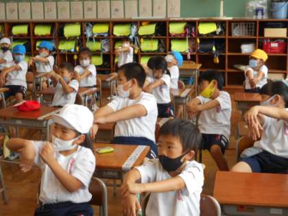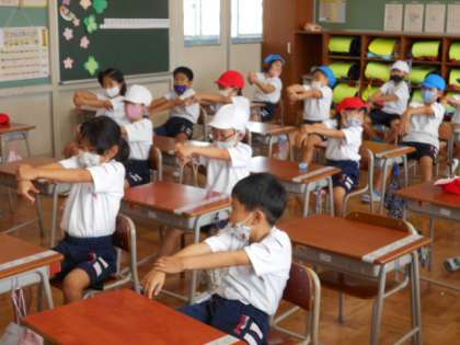 今日のすこやか運動は、椅子に座ってストレッチを行いました。手や首筋を伸ばしたり、深呼吸をしたりして、気持ちよく活動しました。「指がこんなに曲がるよ!」と、曲がるところまで指伸ばしをしている子もいました!
