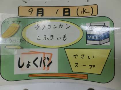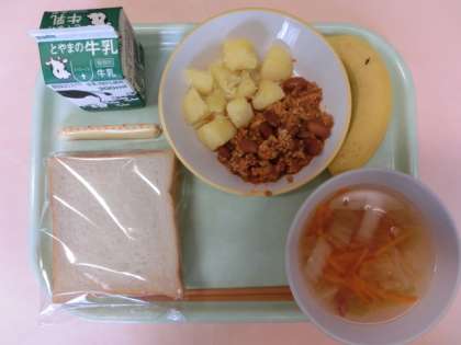 今日の献立は、食パン、牛乳、チリコンカン、こふきいも、やさいスープ、棒チーズ、バナナでした。