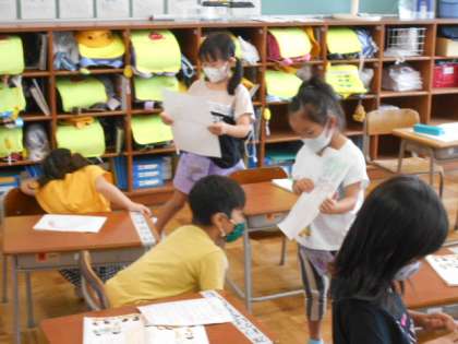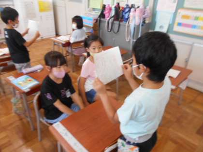 1年生:国語科「ききたいな ともだちのはなし」:9月1日(水) 公開日 2021/09/01 更新日 2021/09/01 1年生の部屋 今日の国語では、「ききたいな、ともだちのはなし」として、夏休みの思い出について、ペアで意見交換を行いました。紙を見ずに話そうとがんばっている子や、自分の書いた絵を見せながら、詳しく話そうとする子。質問タイムでは、たくさんの質問が飛び交い、みんなの夏休みの過ごし方に興味津々の様子でした!