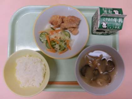 今日の献立は、ごはん、牛乳、鶏肉の米粉揚げ、コールスローサラダ、なすのみそ汁でした。