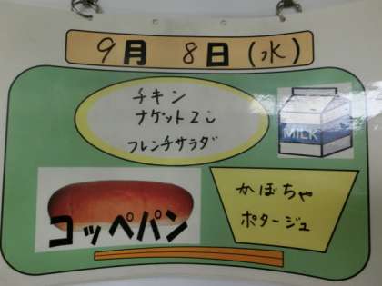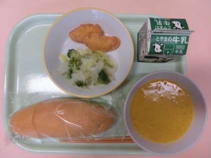 今日の献立は、コッペパン、牛乳、チキンナゲット、フレンチサラダ、かぼちゃポタージュでした。