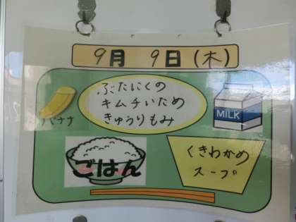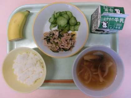 今日の献立は、ごはん、牛乳、豚肉のキムチ炒め、きゅうりもみ、茎わかめスープ、バナナでした。