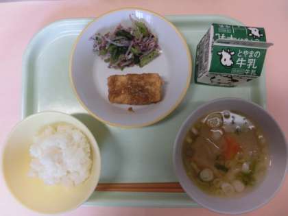 今日の献立は、ごはん、牛乳、揚げ出し豆腐のごまだれかけ、ゆかり和え、みそ汁でした。