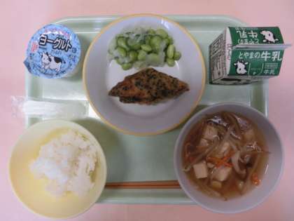 今日の献立は、ごはん、牛乳、ふくらぎのエゴマ揚げ、枝豆のマリネ、豆腐スープでした。