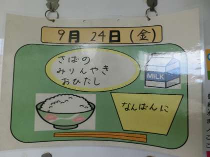 今日の献立は、ごはん、牛乳、サバのみりん焼き、おひたし、南蛮煮でした。