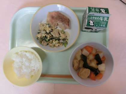 今日の献立は、ごはん、赤魚の塩焼き、きくらげの炒め物、炊き合わせでした。