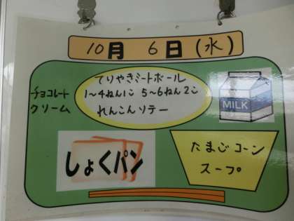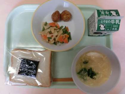 今日の献立は、食パン、牛乳、てりやきミートボール、れんこんソテー、たまごコーンスープ、チョコレートクリームでした。