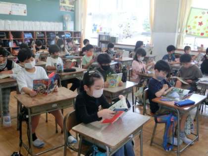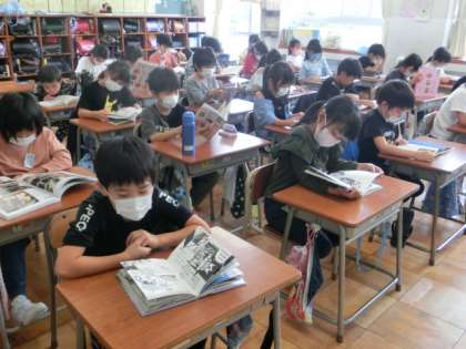 今日は、いもほりが延期になったので「読書タイム」がありました。子供たちは、思い思いの本を静かに読みんでいます。