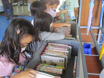 2ヶ月ぶりの自動車文庫。たくさんの本を前に真剣な表情で何を読もうか選んでいました。