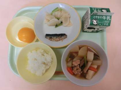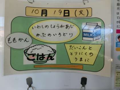 今日の献立は、ごはん、牛乳、いわしのしょうが味、かぶのいろどり、大根と鶏肉のうま煮、ももかんでした。