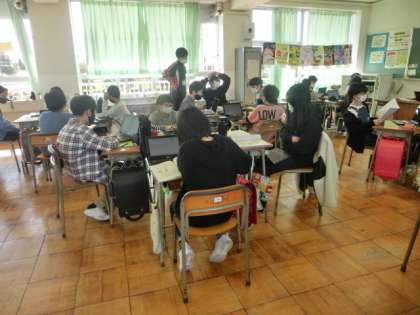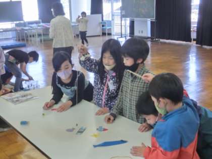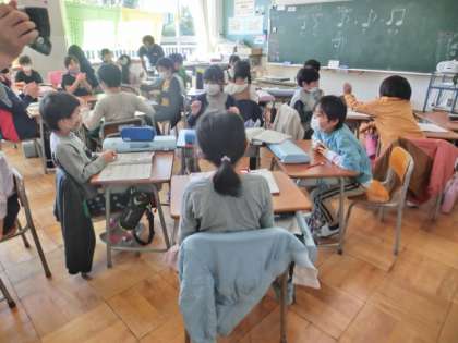 授業では、グループで学び合う活動を行っています。音楽のリズム打ち、生活科のおもちゃ作り、国語科の話合い等です。