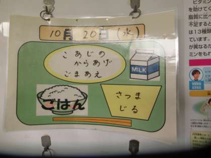今日の献立は、ごはん、牛乳、こあじの唐揚げ、ごま和え、さつま汁でした。