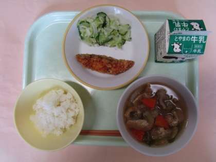 今日の献立は、ごはん、牛乳、魚の竜田揚げ、添え野菜、こんさい汁でした。