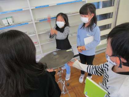 3年生:「音を出して調べよう」:11月2日(火) 公開日 2021/11/04 更新日 2021/11/04 3年生の部屋 理科では、音についての学習をしています。紙笛や輪ゴムギター、シンバルや太鼓など、音が鳴るものに触れながら、音が鳴るときには振動が生まれていることに気付いていました。