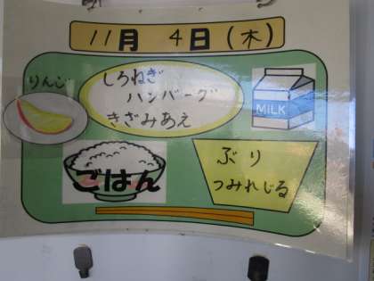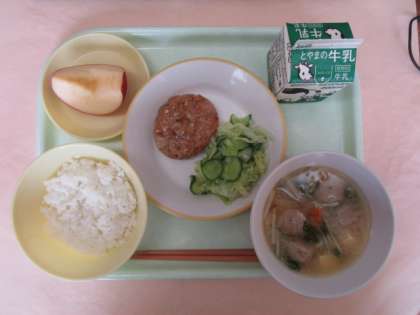 今日の献立は「学校給食とやまの日」で、ごはん、牛乳、白ねぎハンバーグ、きざみ和え、ぶりつみれ汁、りんごでした。