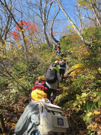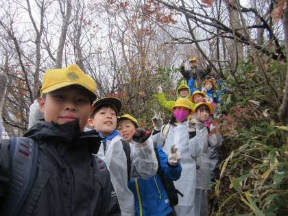 登山では「がんばれ」「ここ滑りやすいよ」と声をかけながら、協力して登っていました。