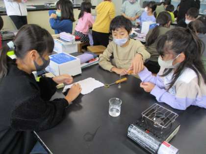 今日は、金属を温めました。初めて使うガスコンロに緊張した様子で、安全に気を付けて実験していました。