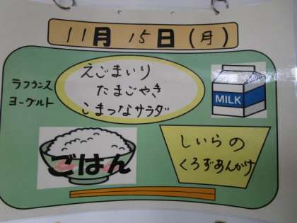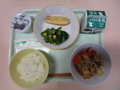 今日の献立は、ごはん、牛乳、えごま入りたまごやき、小松菜サラダ、しいらの黒酢あんかけ、ラフランスヨーグルトでした。