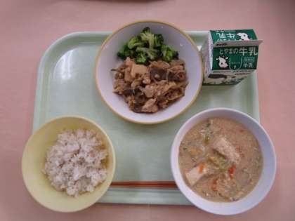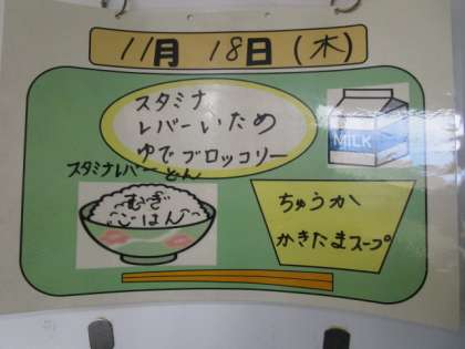 今日の献立は、麦ごはん、牛乳、スタミナレバー炒め、ゆでブロッコリー、中華かき玉スープでした。