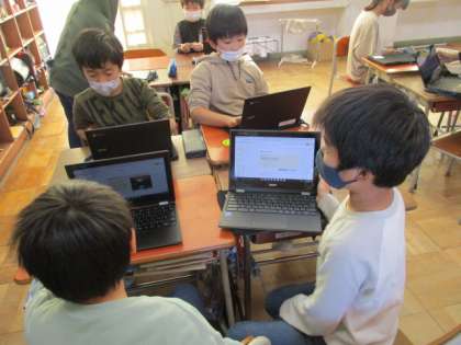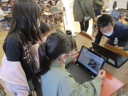 総合的な学習の時間には、これまで高齢者や目の不自由な方について自分の気になることをテーマに、調べ学習をしてきました。今日は、調べたことをスライドにまとめたものを、グループで発表し合いました。