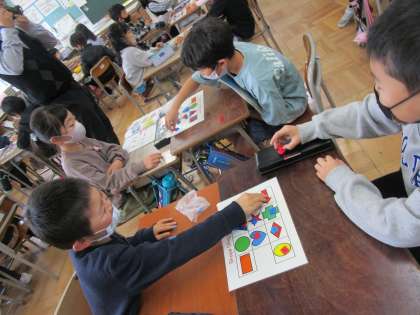 外国語活動では、英語でさまざまな形を言えるようになっています。英語で相手に聞いたり、答えたりするのも上手になってきました。歌やチャンツで楽しく学びながら、友達とも仲良く活動をしています。