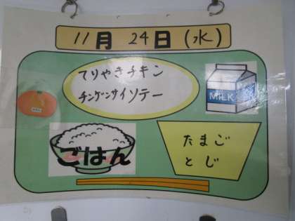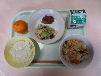 今日の献立は、ごはん、牛乳、てりやきチキン、チンゲンサイソテー、たまごとじ、みかんでした。
