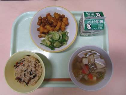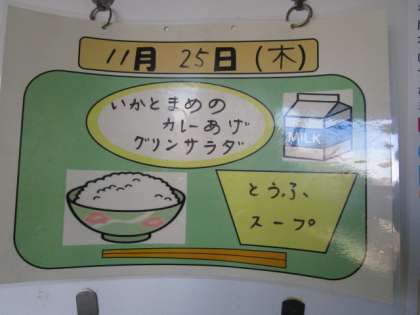 今日の献立は、ごはん、牛乳、イカと豆のカレー揚げ、グリーンサラダ、豆腐スープでした。