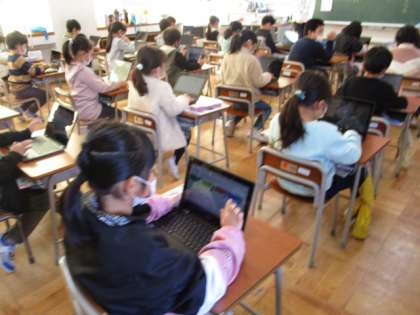 毎週金曜日は、「チーム新保っ子宣言5」の振り返りをクロムブックで行っています。1年生も、クロムブックで振り返りを行い、その後、国語や算数の問題を解いたりしています。