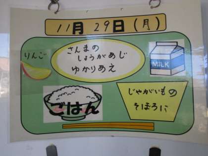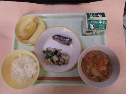 今日の献立は、ごはん、牛乳、サンマのしょうが味、ゆかり和え、じゃがいものそぼろ煮、りんごでした。