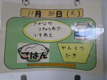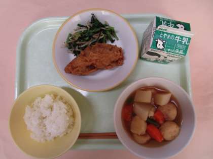 今日の献立は、ごはん、牛乳、魚の利休揚げ、磯和え、関東炊きでした。