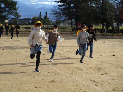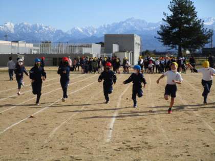 今日は、「すこやか運動」を行いました。中学年は短距離ダッシュの練習、高学年は50m走のタイム測定をしました。立山連峰をバックに思いっきり走っていました。