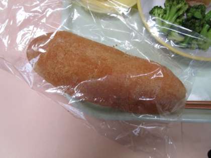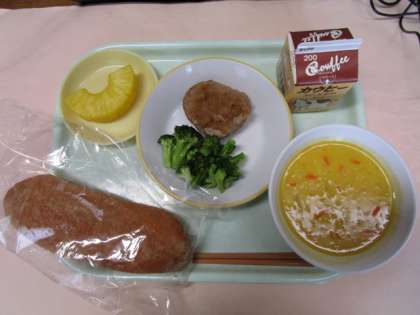 今日の献立は、あげパン、コーヒー牛乳、ハンバーグのおろしソースかけ、ゆでブロッコリー、かぼちゃポタージュ、パイナップルでした。