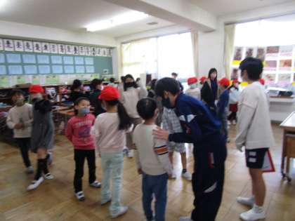 今日の新保っ子タイムは「たてわり遊び」でした。たてわり班のメンバーで、ハンカチ落としや伝言ゲーム等、6年生が考えた遊びを一緒に楽しみました。