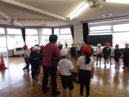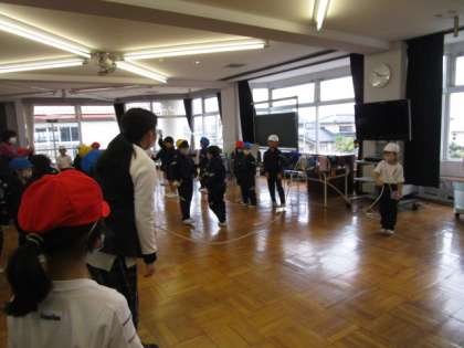 今日の「すこやか運動」は、大なわ、短なわでした。1年生はランチルームで大なわの8の字跳びを練習しました。長いなわとびが怖くて、なかなか跳べない子もいましたが、ゆっくりまわして、1人1人順番に練習しました。