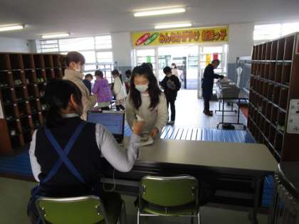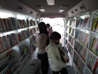 自動車文庫では、全クラスが交代で本を借ります。短い時間ですが、読みたい本を探して借りています。