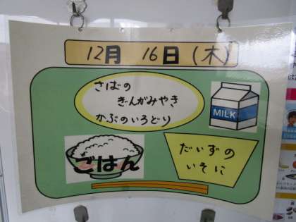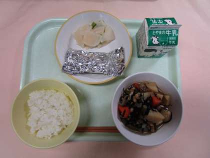 今日の献立は、ごはん、牛乳、サバの銀紙焼き、かぶの色どり、大豆の磯煮でした。