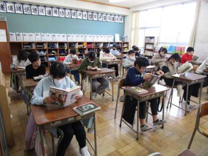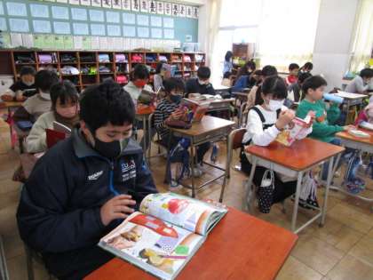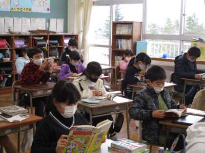 読書タイムでは、物語や歴史まんが、図鑑等、様々な本を読んでいるようです。