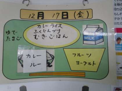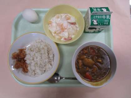 今日の献立は、麦ごはん、カレールー(カレーライス)、牛乳、ゆで卵、福神漬け、フルーツヨーグルトでした。