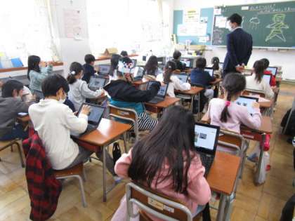 授業では、クロームブックを活用して、問題を解いたり、入力したりしています。また、社会科の動画から、考えを深めています。