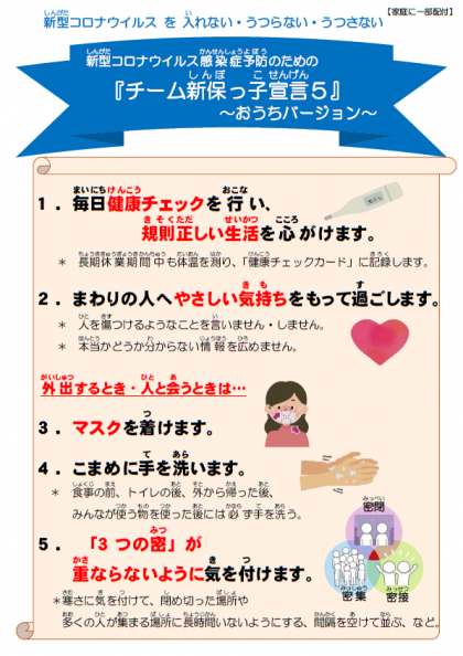 冬休みも「チーム新保っ子宣言5〜おうちバージョン〜」を心がけて過ごしましょう。